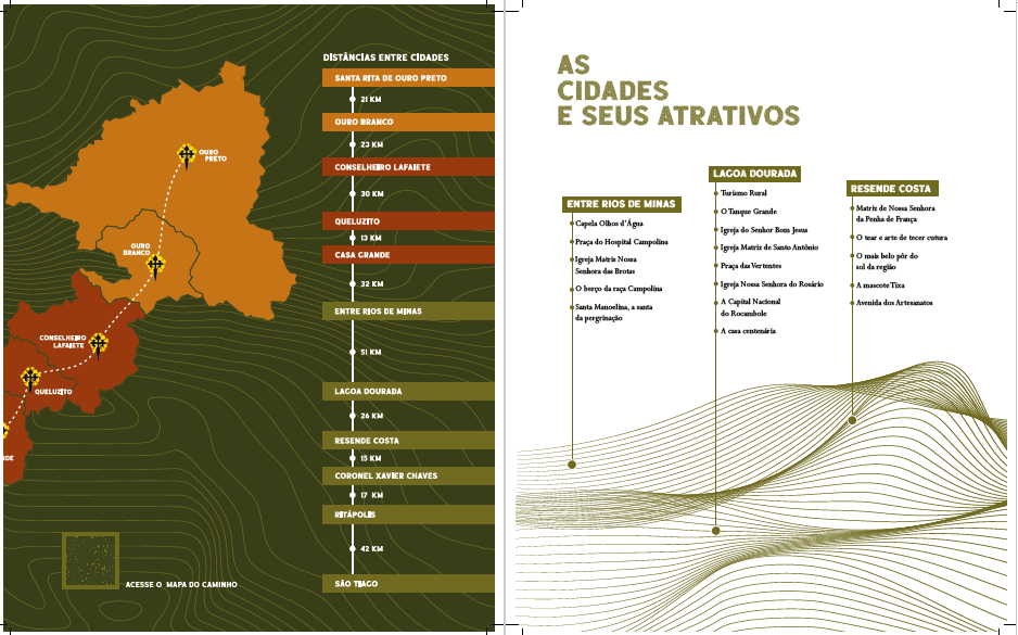Passando pelos municípios de Ouro Preto, Ouro Branco, Conselheiro Lafaiete, Queluzito, Casa Grande, Entre Rios de Minas, Lagoa Dourada, Resende Costa, Coronel Xavier Chaves, Ritápolis e São Tiago. Os trechos foram pensados para atender a diversidade de estratégias que o turista pode utilizar para fazer a rota.
